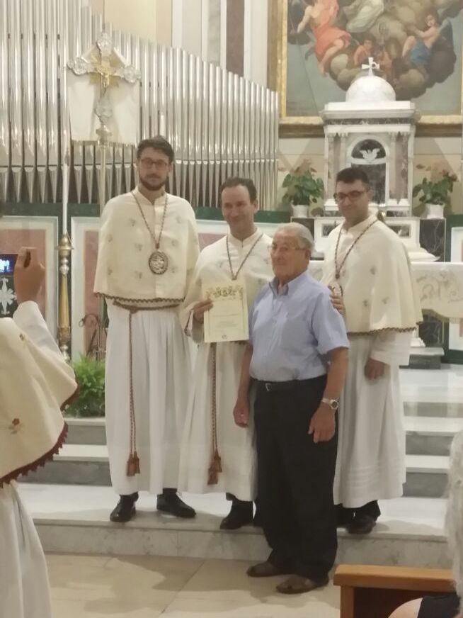 Altro momento significativo è stato quello della consegna delle targhe-ricordo ai già priori viventi della Confraternita Angelo Spagnoletta (2005-2010), Gaetano Petruzzella (1998-2004) e Carlo Roselli (1994-1997). È stata una vera attestazione di stima verso tre “colonne” del nostro Sodalizio che tanto hanno fatto per la crescita della nostra Confraternita reduce, agli inizi degli anni ’90, da un lungo periodo di declino dovuto alla secolarizzazione della società. Se oggi abbiamo una Confraternita viva e in continuo fermento, abbiamo un debito di riconoscenza verso di loro.