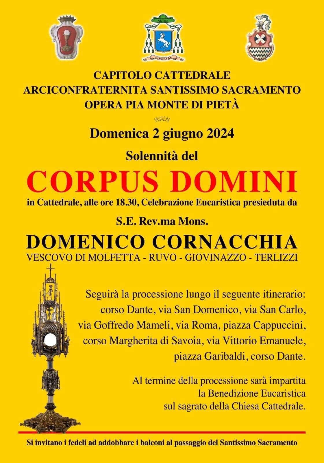 31/05/2024 - Si invitano, in data domenica 2 giugno 2024, alle ore 18:30, i confratelli e le socie della Pia Unione Femminile di Maria Santissima Assunta in Cielo, a partecipare alla Celebrazione Eucaristica che si terrà presso la Cattedrale e che sarà presieduta dal nostro Vescovo mons. Domenico Cornacchia, in occasione della Solennità del Corpus Domini, a cura del Capitolo Cattedrale e dell'Arciconfraternita del Santissimo Sacramento Opera Pia Monte di Pietà.